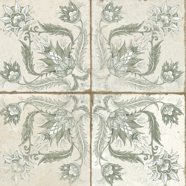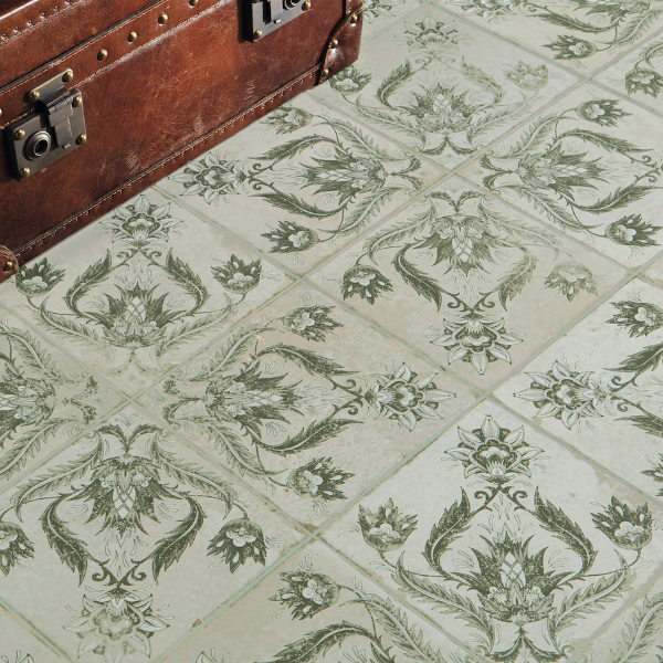 Sage Vintage Ceramic Tile, Elysia inspired by botanical artistry, the Elysia Sage tile brings the charm of hand-painted florals into contemporary interiors. The delicate plant-inspired pattern, paired with a softly aged surface, creates a beautiful vintage character, perfect for statement walls or decorative feature floors.